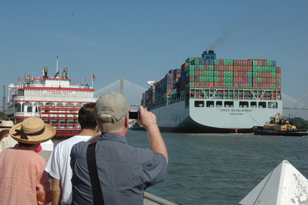 Vicki Summerfield, vacationing from North Dakota with relatives from Germany, learned of the Development's arrival from their hotel's concierge. She said she and her family have enjoyed watching the steady flow of freighters from the Savannah's scenic waterfront.