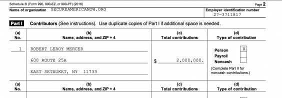 Now, the watchdog group Open Secrets has alleged that Mr Mercer was the most significant of just three donors to Secure America Now. The group’s tax return from 2016, showed that the reclusive Mr Mercer, 71, provided $2m to the organisation.