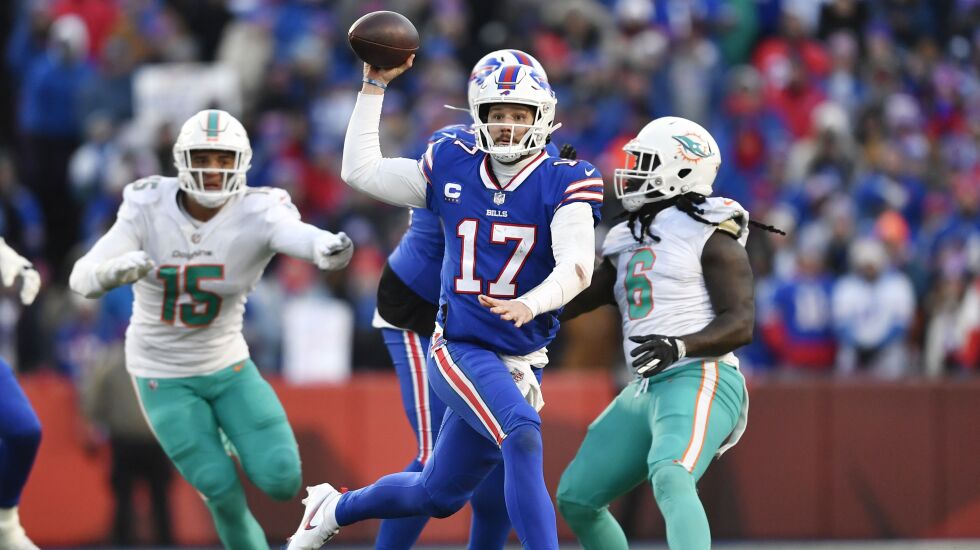 ORCHARD PARK, N.Y. — Josh Allen shrugged off a three-turnover outing by throwing two touchdown passes 3:11 apart in the third quarter, and rallying the Buffalo Bills to a 34-31 win over the injury-depleted Miami Dolphins in an AFC wild-card matchup on Sunday.
