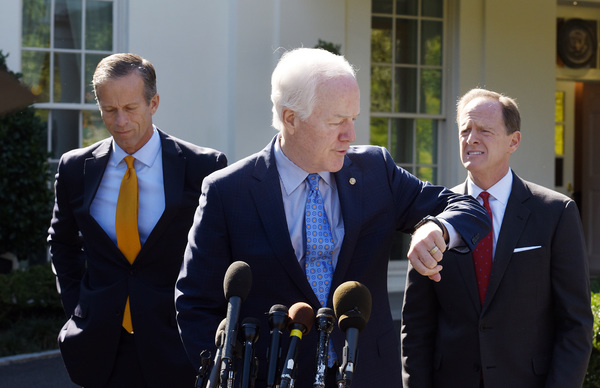 Finance Committee member and GOP Whip John Cornyn _ flanked by John Thune of South Dakota and Patrick J. Toomey of Pennsylvania _ struck an upbeat tone about getting Democratic support, a goal of Trump's.