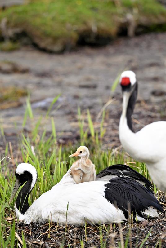 A Japanese crane chick rests on the back of an adult bird beside Lake Furen in Nemuro, Hokkaido, on Saturday. Cranes from the nearby village of Tsurui and other major feeding grounds in the area migrate to the lake to breed between spring and autumn. Crane chicks grow up to about 30 centimeters tall around this time of the year. They can be seen following in the steps of their parents, who feed them crabs and small fish from their beaks. The sight of chicks snuggling on their parents' backs is a treasured spectacle among twitchers.