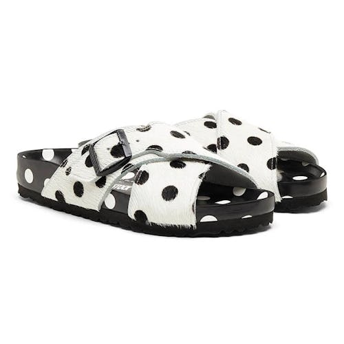 Spearheading the collab’s aesthetic sensibility is a focus on monochromatic colors, polka dots, and PVC, a flexible synthetic plastic. Black and white polka dots, a staple in the Manolo Blahnik line, dress the closed-toe Boston clog and the Rodra sandal. The latter is a new silhouette made especially for the collab, featuring criss-cross straps across the midfoot and a signature Birkenstock buckle. Each is also given an all-over calf hair exterior for added softness — so maybe not a great contender for poolside splashing.