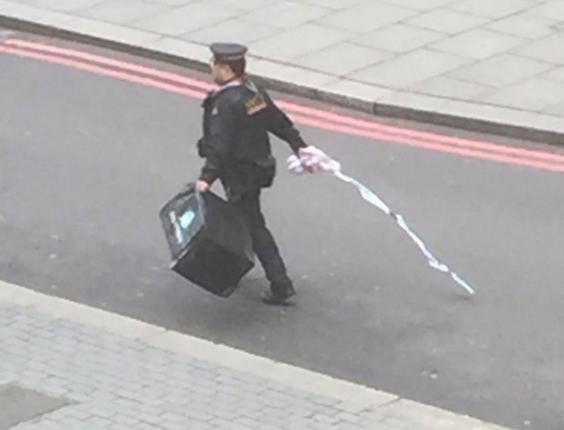 A photo of a police officer carrying a large bag from Deliveroo, a premium food delivery service, sparked speculation that a misplaced takeaway was to blame.