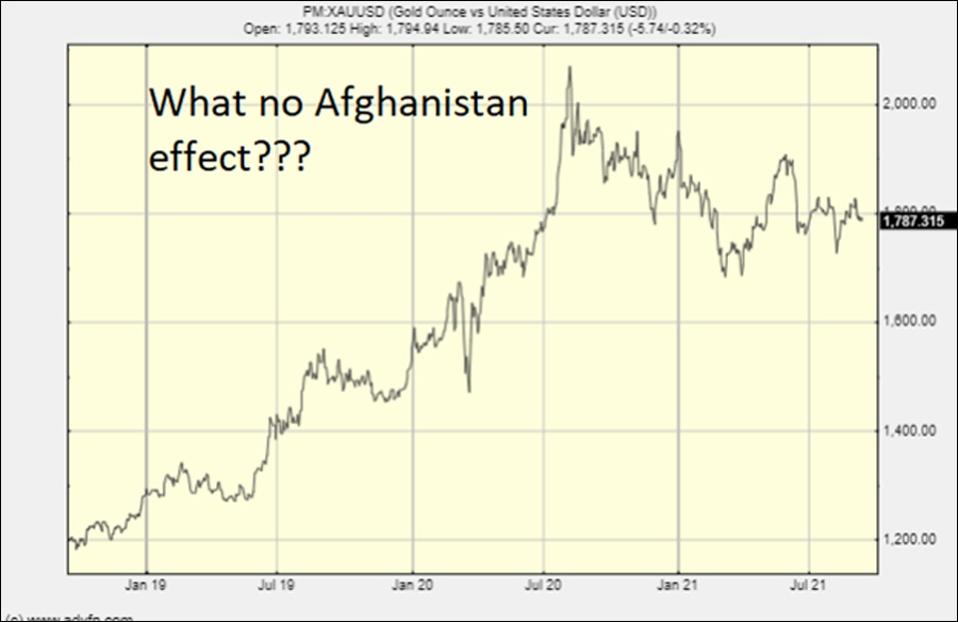 Bitcoin is now without doubt the place to go if you want a haven. If gold had gone through the roof everyone would have pointed at Afghanistan as the reason. Gold did not go through the roof and here is the chart: