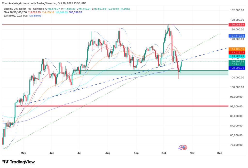 Bitcoin today hovers near $110,600 after rebounding from the $107,000–$108,000 demand zone.