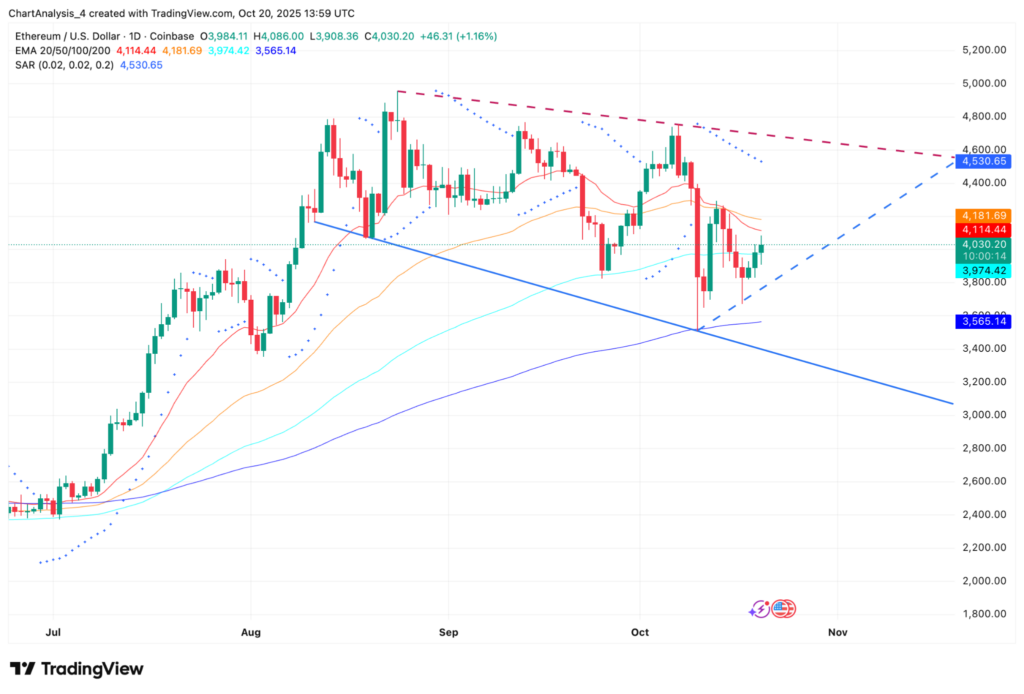 Ethereum trades around $4,020, bouncing from its $3,800 support and 100-day EMA.