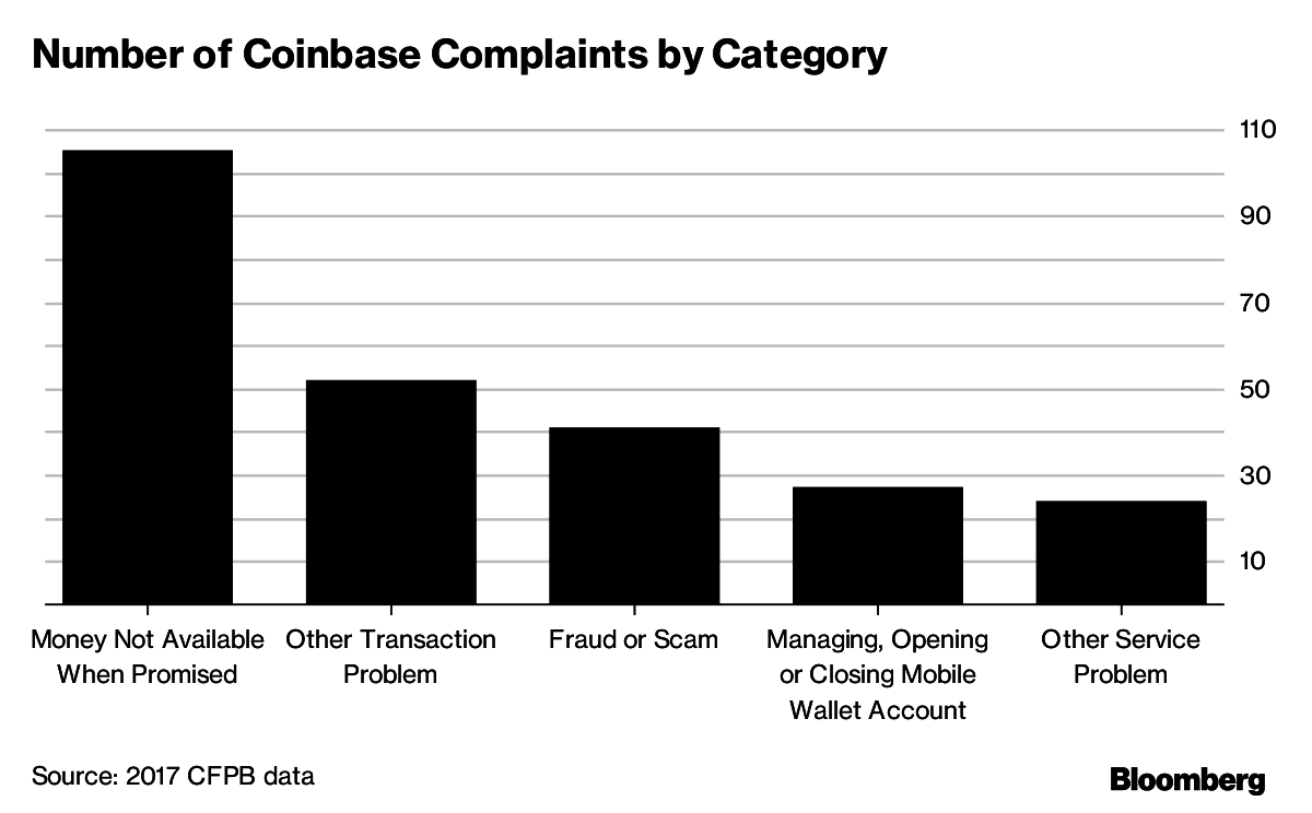 The U.S. Consumer Financial Protection Bureau has received at least 293 complaints about Coinbase Inc., according to data reviewed by Bloomberg. That compares with about six complaints for all of 2016, and makes Coinbase the biggest recipient of CFPB virtual currency complaints this year. The website has struggled to keep up with spiking volume and longer transaction processing times as the value of bitcoin and other cryptocurrencies soared to record highs.