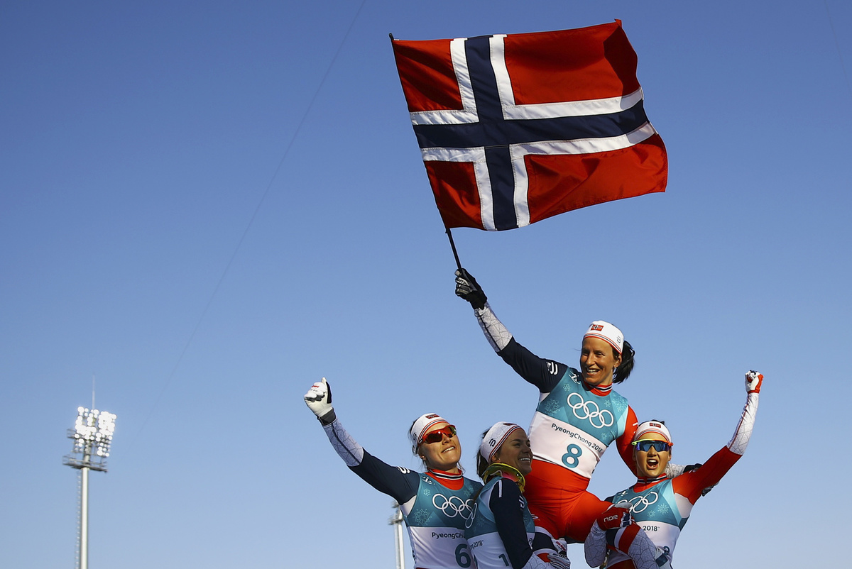 Cross-Country Skiing - Pyeongchang 2018 Winter Olympics - Women's 30km Mass Start Classic - Alpensia Cross-Country Skiing Centre - Pyeongchang, South Korea - February 25, 2018 - Winner Marit Bjoergen of Norway waves the Norwegian flag as she is carried by her teammates. REUTERS/Carlos Barria