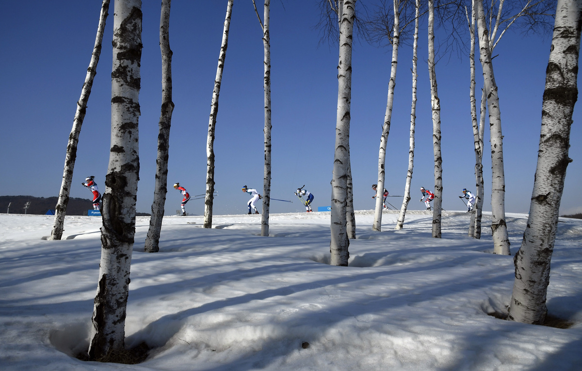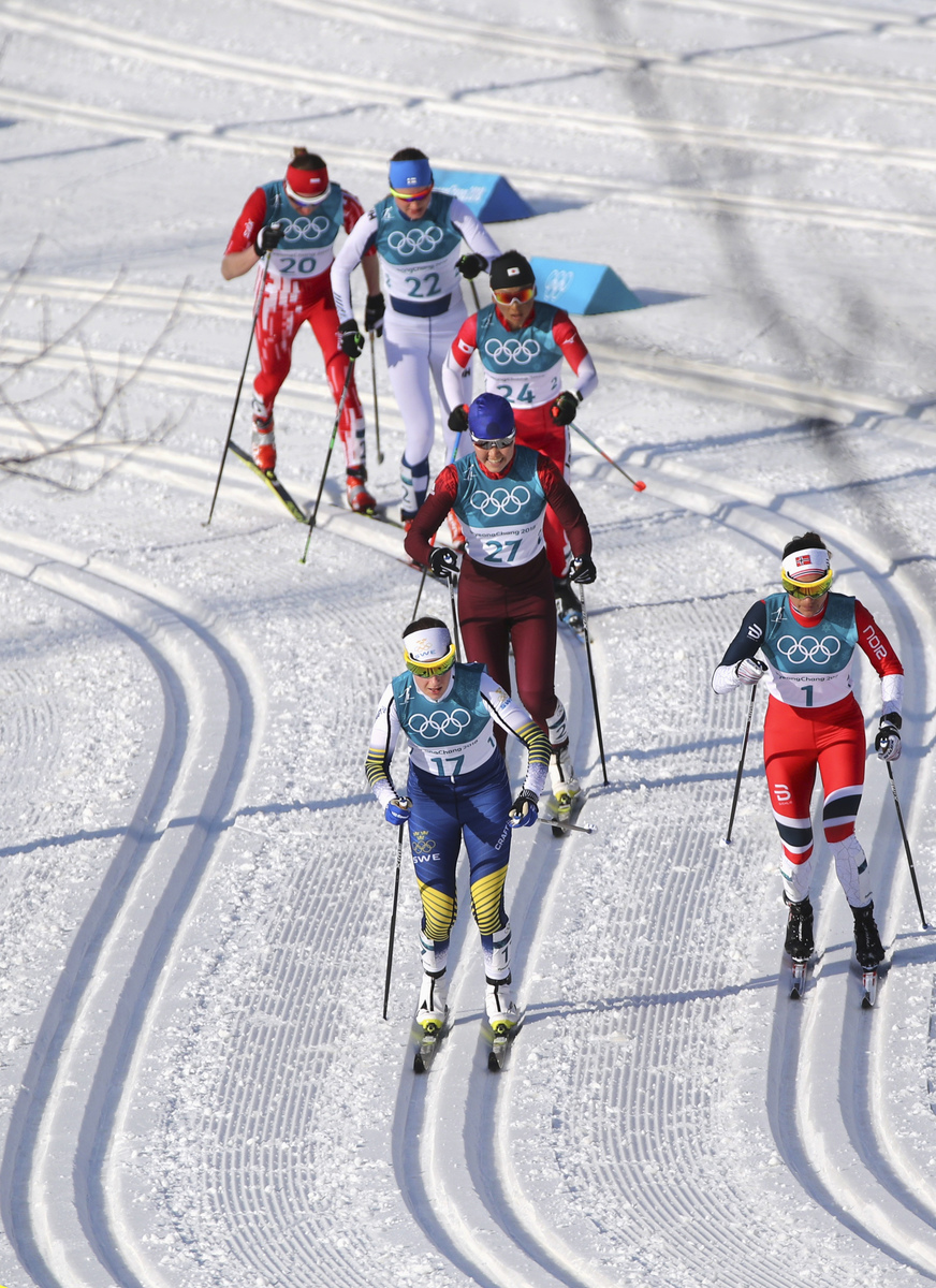 Cross-Country Skiing - Pyeongchang 2018 Winter Olympics - Women's 30km Mass Start Classic - Alpensia Cross-Country Skiing Centre - Pyeongchang, South Korea - February 25, 2018 - Ebba Andersson of Sweden and Heidi Weng of Norway. REUTERS/Carlos BarriaMarit Bjoergen of Norway leads the pack in the women's 30km cross-country mass start classic. REUTERS/Toby MelvilleCross-Country Skiing - Pyeongchang 2018 Winter Olympics - Women's 30km Mass Start Classic - Alpensia Cross-Country Skiing Centre - Pyeongchang, South Korea - February 25, 2018 - Marit Bjoergen of Norway competes. REUTERS/Toby MelvilleCross-Country Skiing - Pyeongchang 2018 Winter Olympics - Women's 30km Mass Start Classic - Alpensia Cross-Country Skiing Centre - Pyeongchang, South Korea - February 25, 2018 - Stina Nilsson of Sweden competes. REUTERS/Toby Melville