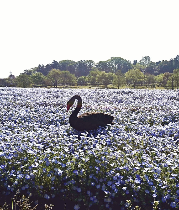 A black swan wades in a field of nemophila, which is in season until around the end of April, at Kairakuen park in Mito. Kairakuen Park Center said the annual flowers, which are native to North America, cover a total of 6,620 square meters in two locations at the park. A river runs between Kairakuen and Lake Senba, with the white and black swans that live in the lake traveling to the park via the river or by flying.