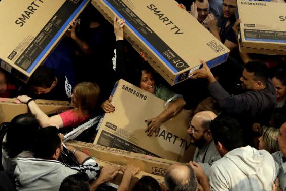 Scenes of mayhem were captured on camera in Brazil, where huge crowds of customers can be seen scuffling in their attempts to grab cut-price televisions.