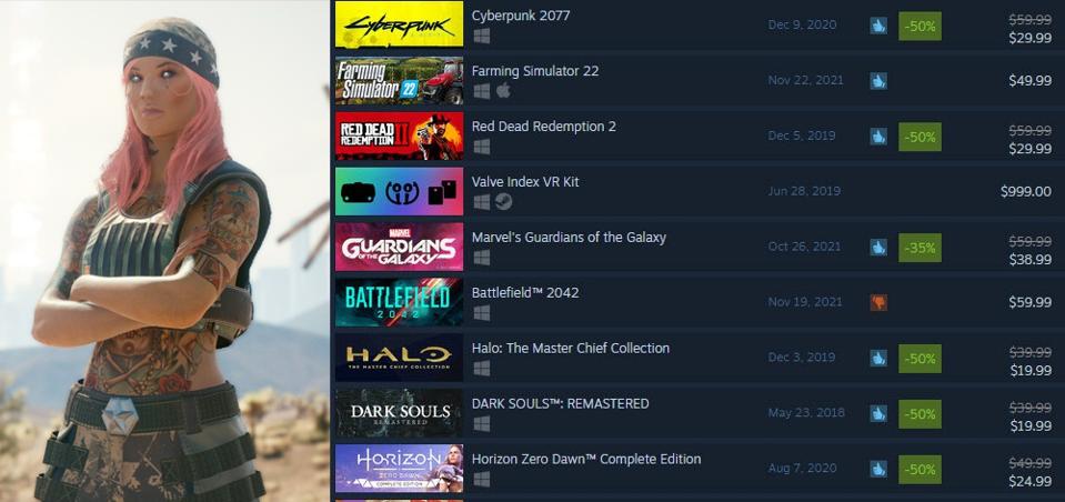 As a result, sales have spiked, and Cyberpunk 2077 is now the top selling game on Steam at the moment, over the just-released Farming Simulator 22, and the also half-off Red Dead Redemption 2.