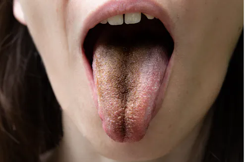 Tongues can also be discoloured white and, believe it or not, black. Conditions like thrush can cause a white tongue, whereas lingua villosa nigra means a black hairy tongue. The name comes from the elongation of the smallest papillae so they look like hairs. It’s associated with smoking, dry mouths and poor oral hygiene.