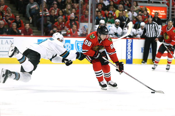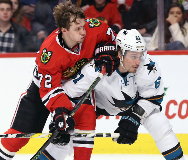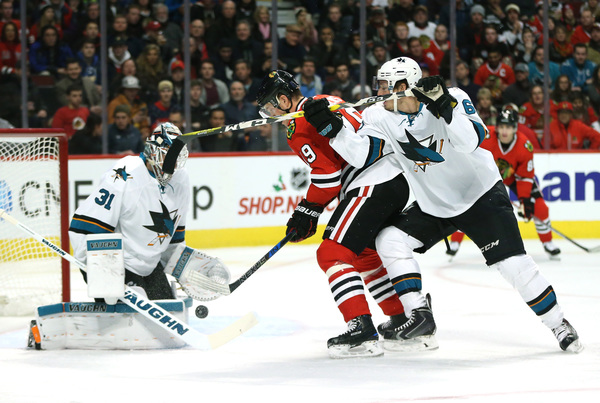 The Hawks fell behind 1-0 early in the second period when Joe Pavelski deflected in a Brent Burns shot. The Hawks appeared sluggish, understandable given their busy recent schedule.