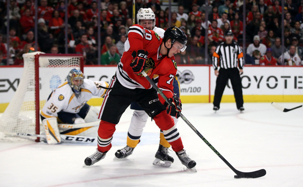 The Hawks got the scoring started in familiar fashion _ an Artemi Panarin one-timer. This one came off a feed from Patrick Kane that made it in the net over Pekka Rinne's right shoulder. It was Panarin's ninth slap-shot goal this season.