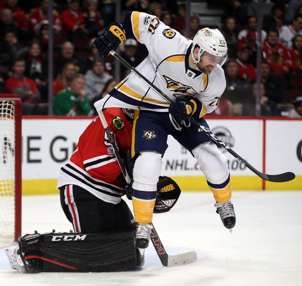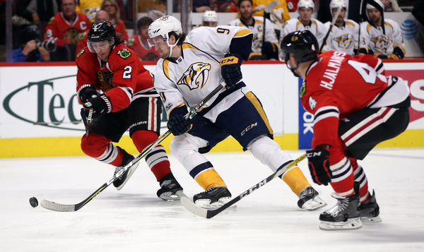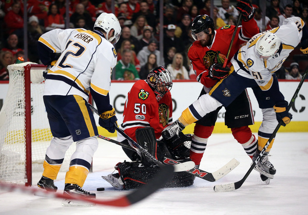The teams played a scoreless second period before the Predators tied it up 2:01 into the third. Austin Watson slammed home a puck that trickled underneath goaltender Corey Crawford. Mike Fisher had the original shot that put the puck on net.