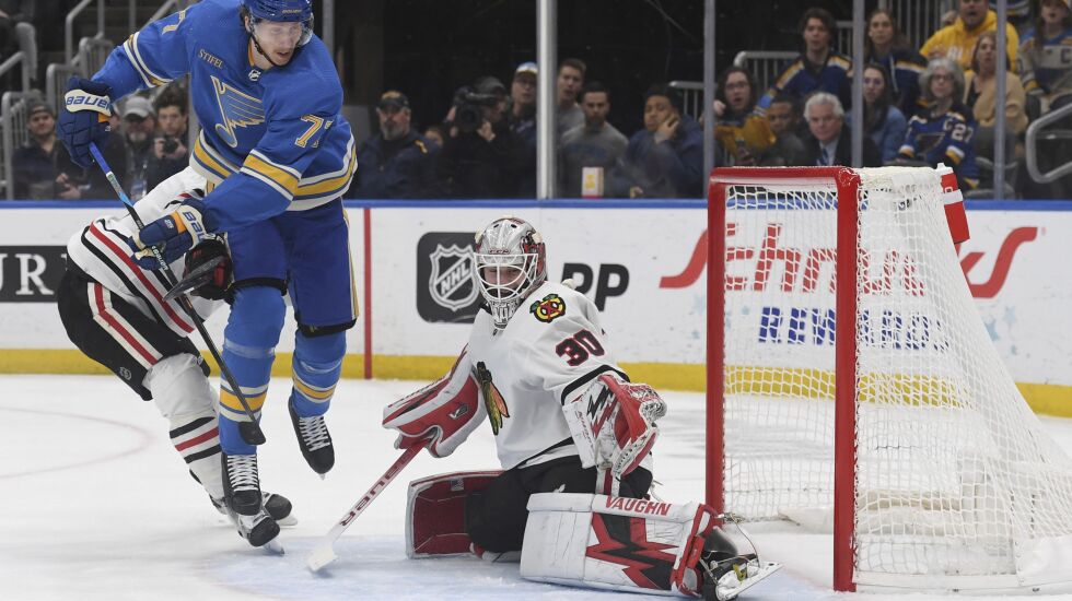 Goaltending issues instead appeared on the opposite end. The Hawks chased Blues stalwart Jordan Binnington by scoring four times on their first seven shots.