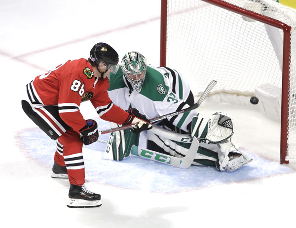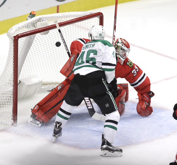 But from there the Stars controlled much of the action in the first period. They scored their first goal at 7:21 when Brett Ritchie fired home a shot from the slot that goalie Corey Crawford got a pad on before it went into the net.