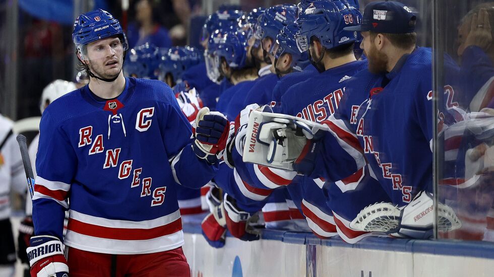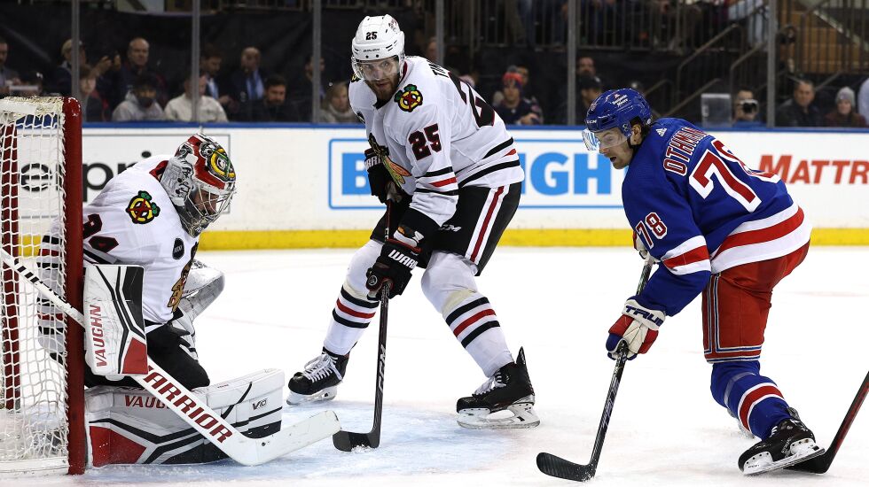NEW YORK — Injured forward Andreas Athanasiou wasn’t present Thursday, but that didn’t stop Rangers captain Jacob Trouba from inflicting pain on the rest of the Blackhawks.