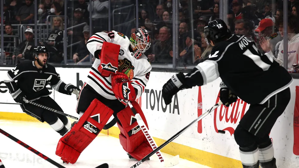 The Kings’ big third-period minute, featuring a breakaway goal by Andreas Athanasiou and a two-on-one goal by Trevor Moore, initially seemed even more disastrous for the Hawks when goalie Collin Delia (31 saves) needed to be helped off the ice after Moore’s tap-in. But it turned out Delia was just cramping rather than injured, King said.