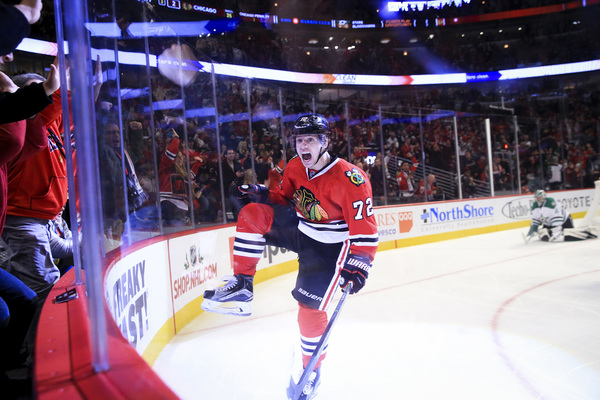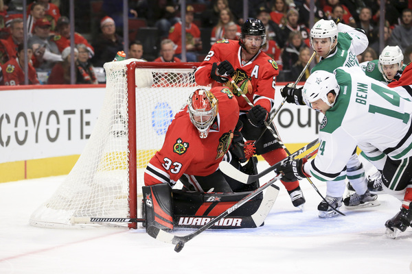 The Hawks answered 52 seconds later when Marian Hossa shot the puck from the left wing. Kari Lehtonen stopped the puck initially but it rolled past him and into the net at 2:17 to tie the score at 1.