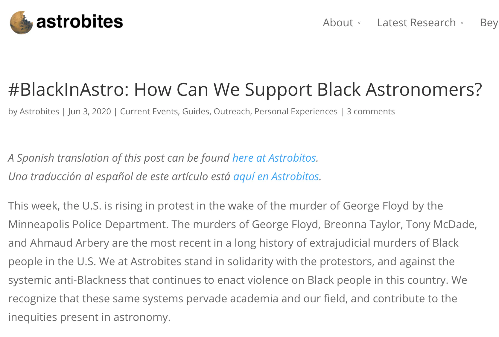Members of AstroBites are also a few of the organizers behind a strike set for Wednesday, June 10 under the hashtags #ShutDownSTEM and #Strike4BlackLives. The strike itself is a call on science organizations and academics to stop doing business as usual and take a day to reflect on the ongoing events and how it relates to the field so that they can come up with a plan of action moving forward. Some examples of strike actions are postponing meetings, not publishing papers, and organizing protests. The effect of these strike actions could mean that the pace of research slows, sure, but the main point is to declare that the culture of exclusion cannot continue.