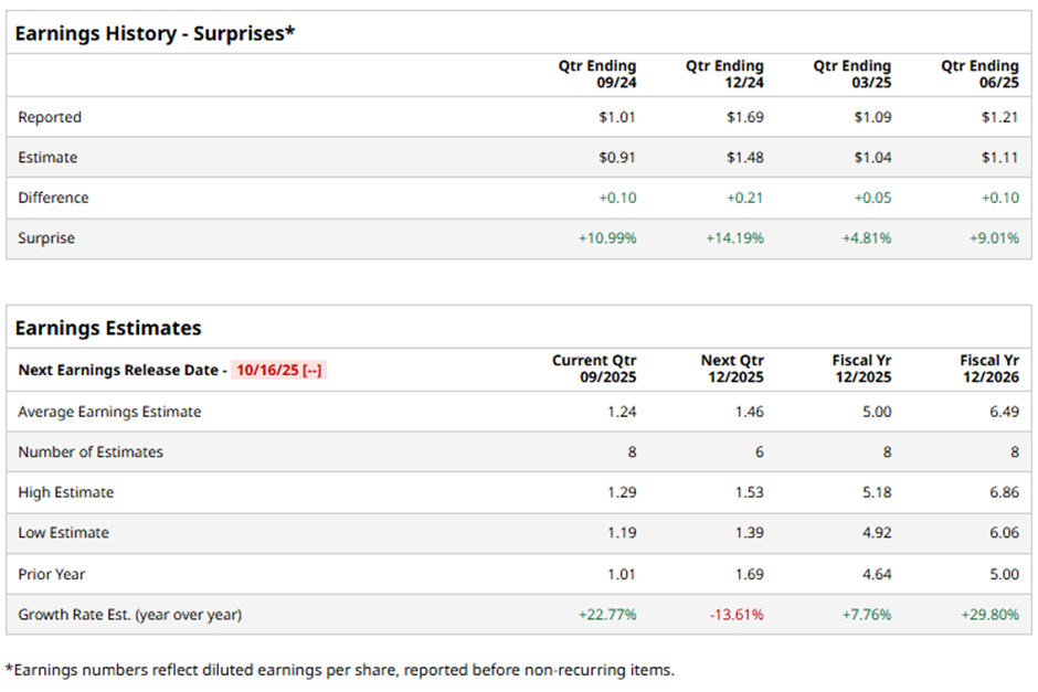 The San Francisco, California-based company is expected to release its fiscal Q3 2025 earnings results on Thursday, Oct. 16. Ahead of this event, analysts expect BX to report an EPS of $1.24, up 22.8% from $1.01 in the prior year's quarter. It has surpassed Wall Street's bottom-line estimates in the past four quarters.
