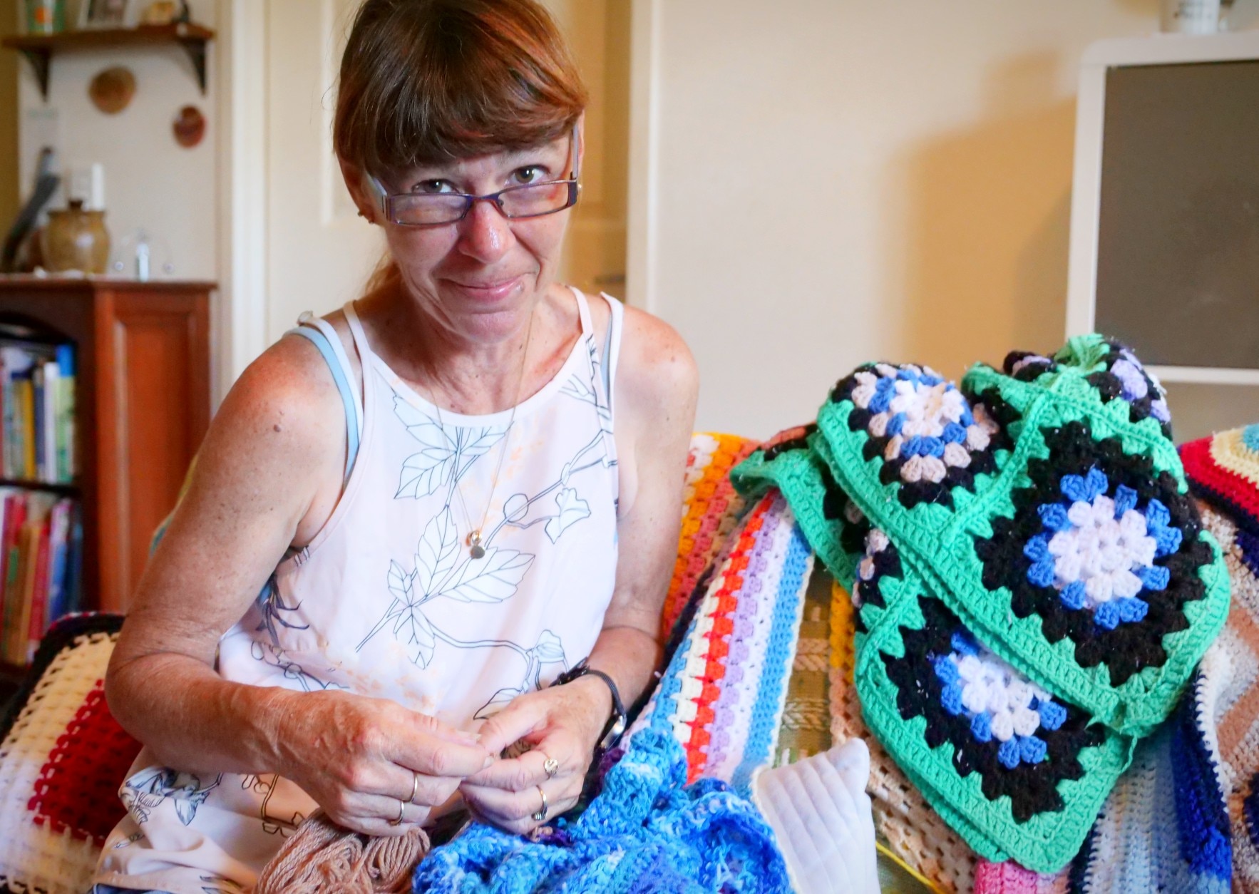 Seven years on, she estimates she's knitted and crocheted thousands of blankets, baby booties, and teddy bears, sometimes with her own wool, or donated supplies.