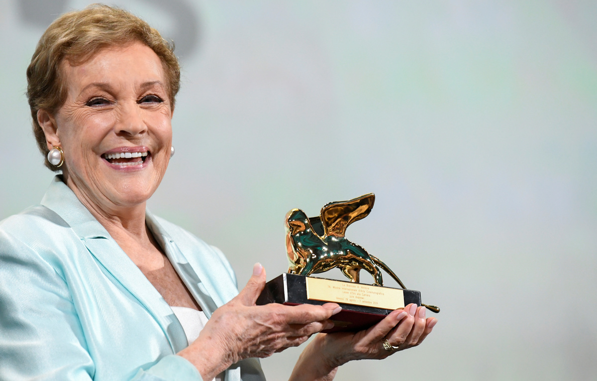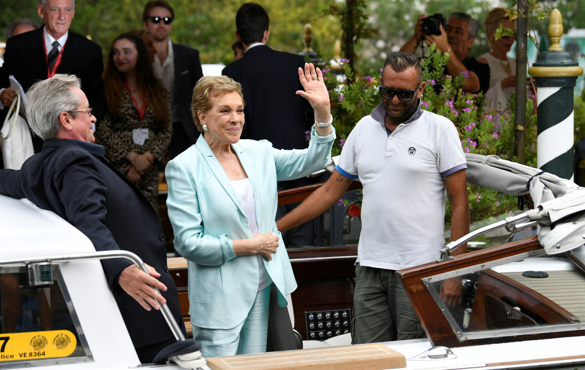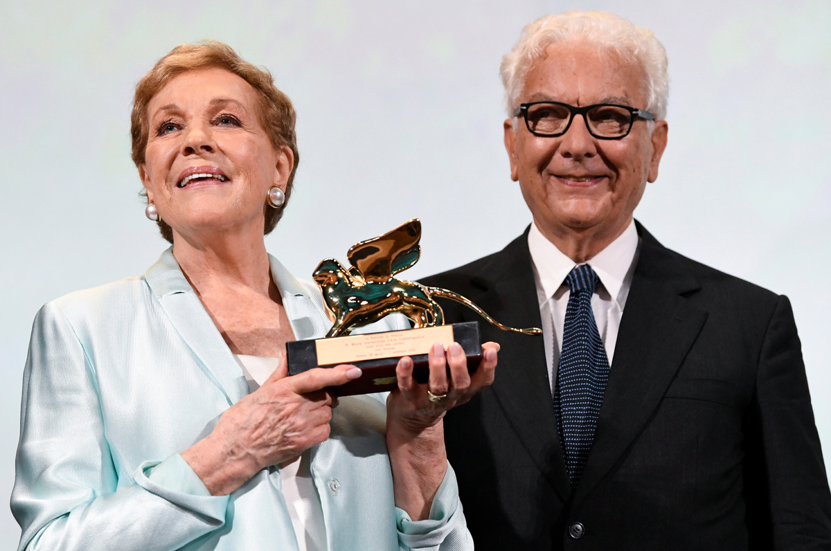 The 76th Venice Film Festival - Golden Lion for Lifetime Achievement ceremony - Venice, Italy, September 2, 2019 - Julie Andrews speaks with Venice Biennale President Paolo Baratta after receiving the Golden Lion for Lifetime Achievement award. REUTERS/Piroschka van de WouwThe 76th Venice Film Festival - Golden Lion for Lifetime Achievement ceremony - Venice, Italy, September 2, 2019 - Julie Andrews poses with the Golden Lion for Lifetime Achievement award next to Venice Biennale President Paolo Baratta. REUTERS/Piroschka van de WouwThe 76th Venice Film Festival - Golden Lion for Lifetime Achievement ceremony - Venice, Italy, September 2, 2019 - Julie Andrews gestures next to Italian director Luca Guadagnino as they arrive for a ceremony. REUTERS/Piroschka van de WouwThe 76th Venice Film Festival - Golden Lion for Lifetime Achievement - Venice, Italy, September 2, 2019 - Julie Andrews arrives in Venice. REUTERS/Piroschka van de Wouw