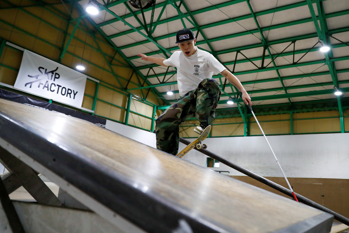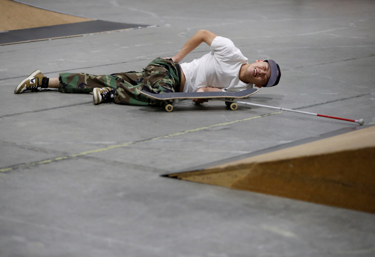 TOKOROZAWA, Japan (Reuters) - Ryusei Ouchi takes a deep breath as he uses his cane to feel out the edge of the three-metre-high ramp, shuffles to the edge and then drops in.