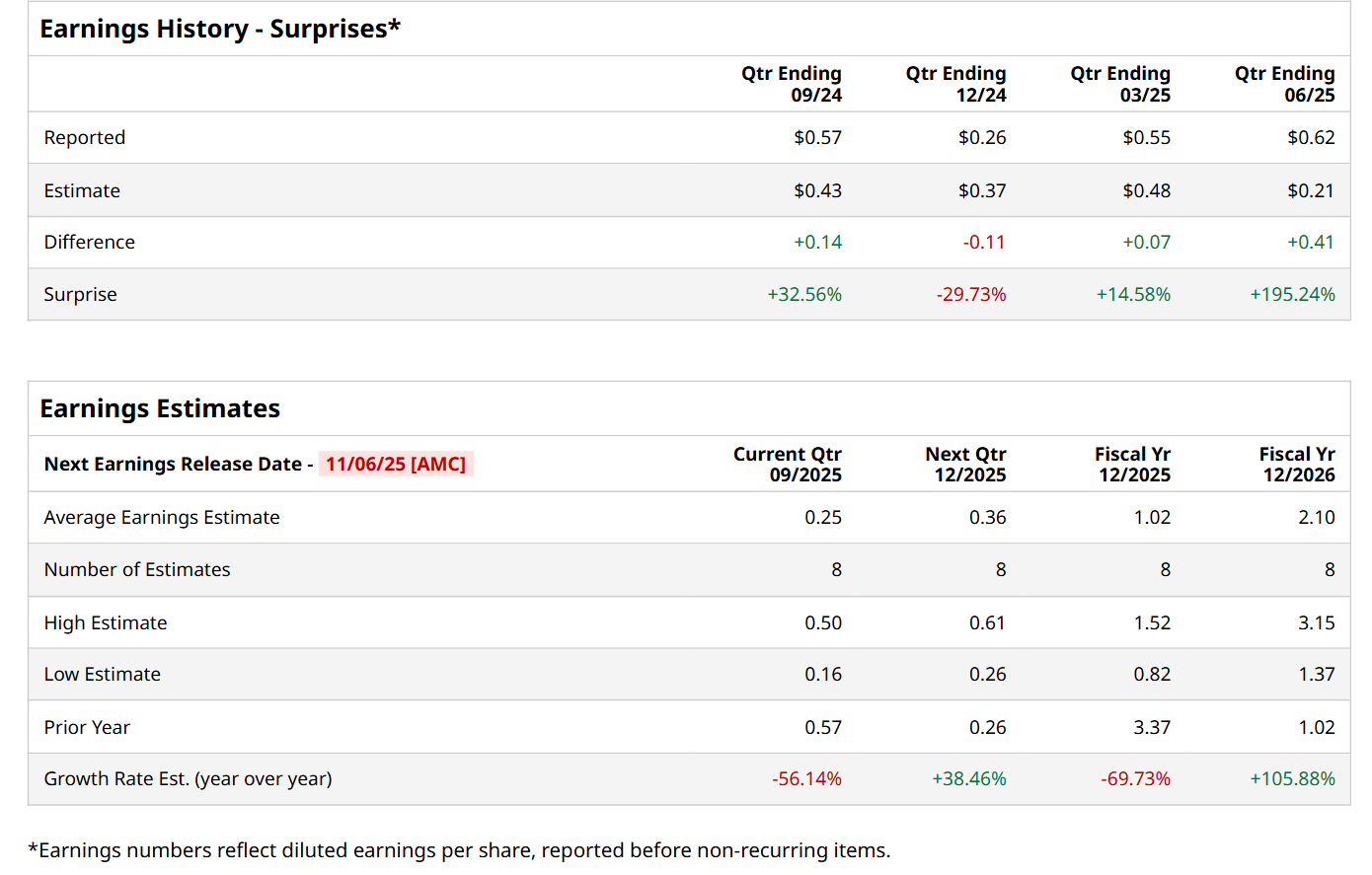 Valued at a market cap of $46.3 billion, Block, Inc. (XYZ) is a global technology and financial services company that builds tools to help individuals and businesses participate in the digital economy. The Oakland, California-based company’s continued investment in emerging technologies, including blockchain and digital finance, supports its mission to create economic empowerment through modern financial tools. It is scheduled to announce its fiscal Q3 earnings for 2025 after the market closes on Thursday, Nov. 6.