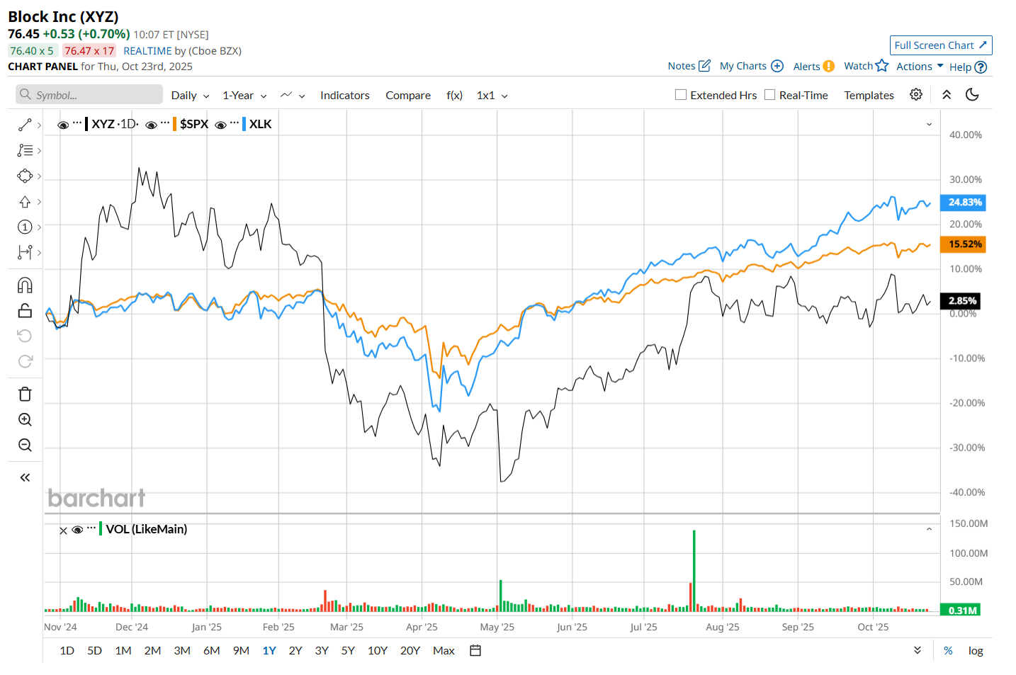 Block has gained 11% over the past 52 weeks, underperforming both the S&P 500 Index's ($SPX) 16.4% return and the Technology Select Sector SPDR Fund’s (XLK) 26.7% rise over the same time frame.
