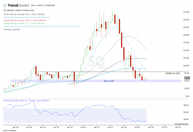 A break and close below $50 could set the stage for Block stock to retest the lows it saw in the $30s during the height of the covid selloff.