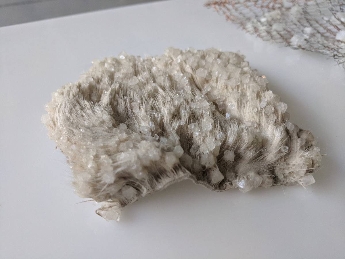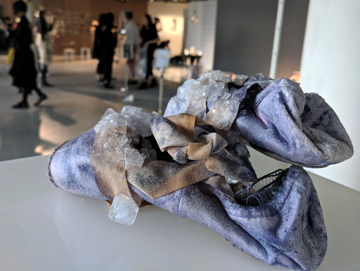 Royal College of Art graduate Alice Potts showcased her quirky design methods with a pair of ballet shoes adorned with crystals formed from sweat and a fake fur featuring urine-crystals at the RCA's annual fashion show.