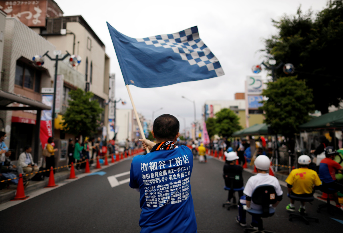 Racers receive checkered flag during ISU-1 Hanyu Grand Prix, while taking part in the office chair race ISU-1 Grand Prix series, in Hanyu, north of Tokyo, Japan, June 9, 2019. REUTERS/Issei Kato