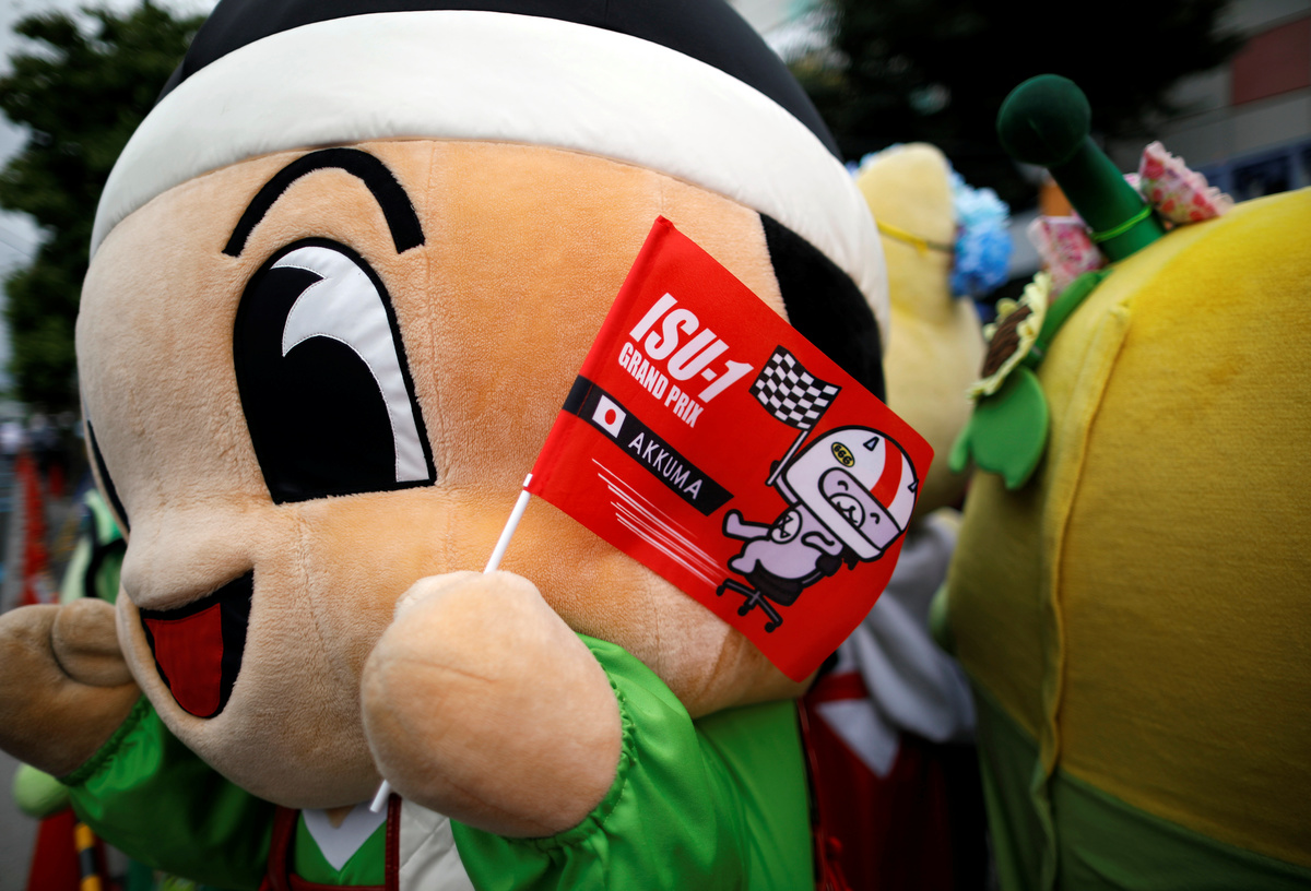 Character mascot cheers up racers during ISU-1 Hanyu Grand Prix, while they are taking part in the office chair race ISU-1 Grand Prix series, in Hanyu, north of Tokyo, Japan, June 9, 2019. REUTERS/Issei Kato