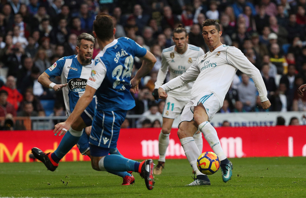 Ronaldo was unable to continue playing after he was left with a bloodied face by the boot of Deportivo defender Fabian Schar as he struck his second goal, which took him level with Bale as Real's top scorer in the league with six strikes.
