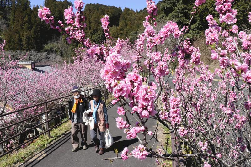 Blooming peach flowers have painted the surroundings of a roadside rest area in Tenryu Ward, Hamamatsu, a lucious pink -- a harbinger of the coming of spring.