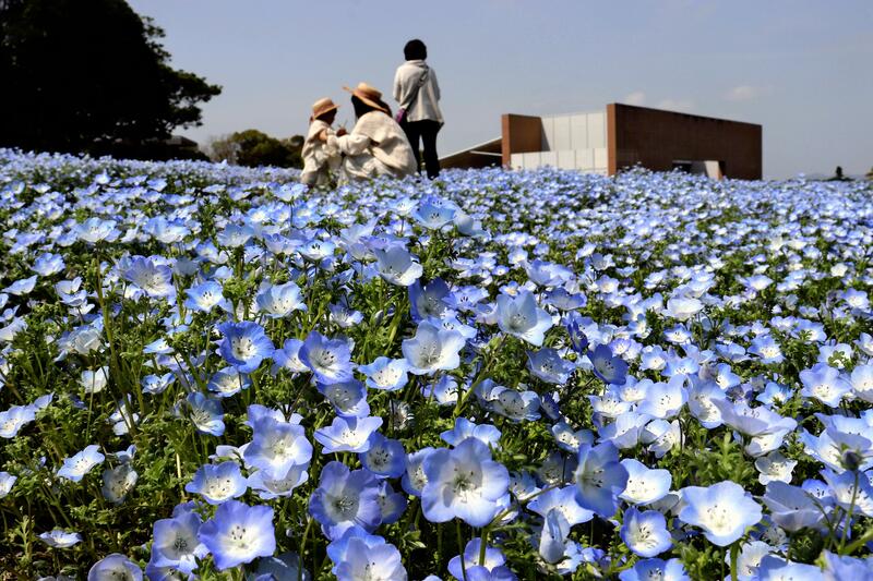Nemophila flowers, also known as baby blue eyes, are in bloom at Hamanako Garden Park in Nishi Ward, Hamamatsu. Blue and white nemophila, along with colorful violas, form an image of Mt. Fuji and a rainbow, which can be viewed from the park's observation deck. About 300,000 plants grow in the 3,000-square-meter area. Visitors can see the flowers at their best through mid-April.