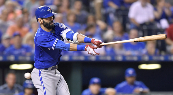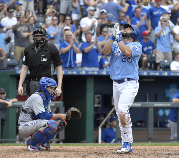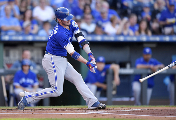 The Toronto leadoff man's first shot came just four pitches into the game. His final one dropped into the Royals' bullpen.