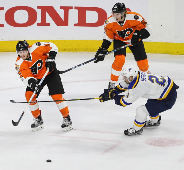 The Blues' penalty-killing erased to Philadelphia power plays before the visitors earned their first man-advantage, a four-minute, double-minor high-sticking call against the Flyers' Andrew MacDonald.