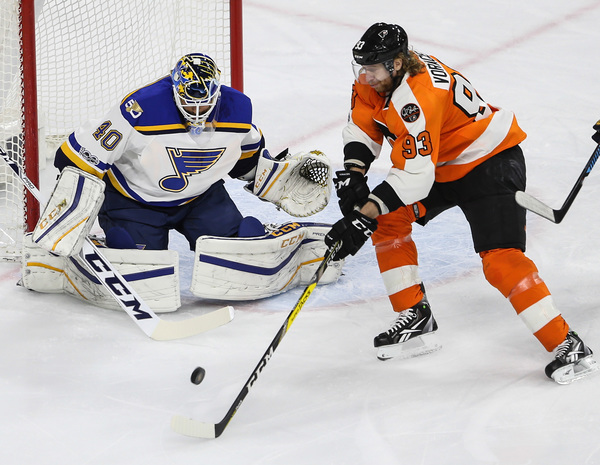 The Blues were outshot 26-16, but Hutton and the defense held on for the shutout, thwarting a late 6-on-4 advantage that was result of a Flyers' power play and pulling the goalie for an extra attacker. They have now been blanked in back-to-back games, spanning 122:49.