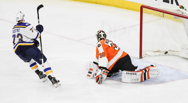 The Blues added to their lead with Agostino's first goal as a Blue. He took a stretch pass from David Perron and, on a breakaway, ripped a shot past off the glove of Flyers goalie Michal Neuvirth for a 2-0 just 2:50 into the third period.