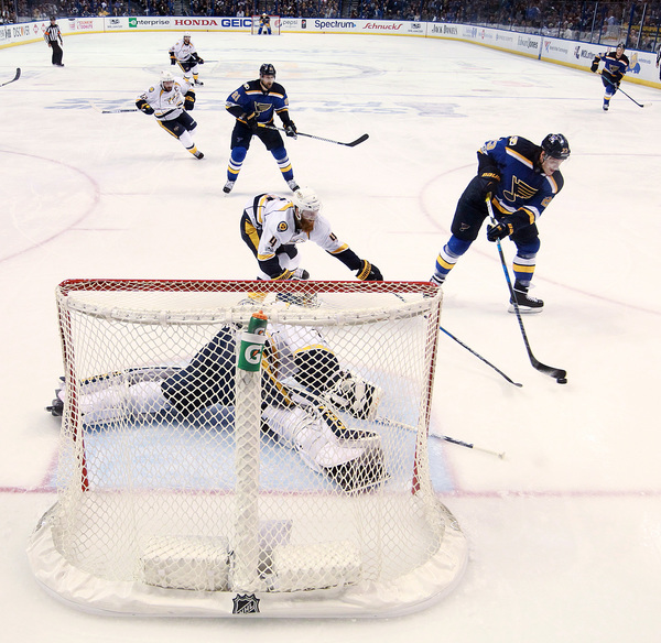 It took five games, but the Blues could finally claim scoring the game's first goal in this series. The Predators had done so in the first four.