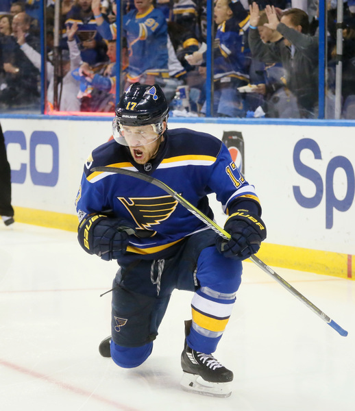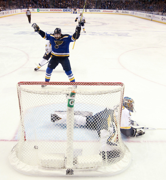 After a dropping Games 3 and 4 in Nashville, they returned home to a crowd of 19,168, who panicked a bit after watching Alexander Steen take warmups but then get scratched due to a lower-body injury. But in Steen's place, forgotten forward Dmitrij Jaskin, who had yet to make an appearance this postseason, scored a second-period goal that got the Blues going, and after Nashville tied it on a power-play goal by James Neal later in the period, Schwartz netted the game-winner just 25 seconds into the third period.