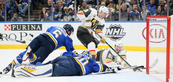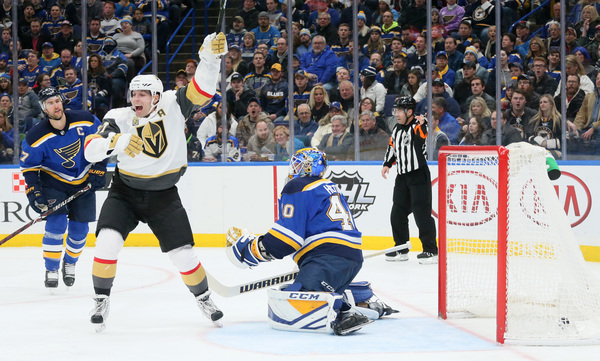 Alexander Steen gave the Blues a 1-0 lead at the 9:35 mark of the first period. The Golden Knights tied the game at the 9:23 mark of the second period on an Erik Haula goal.