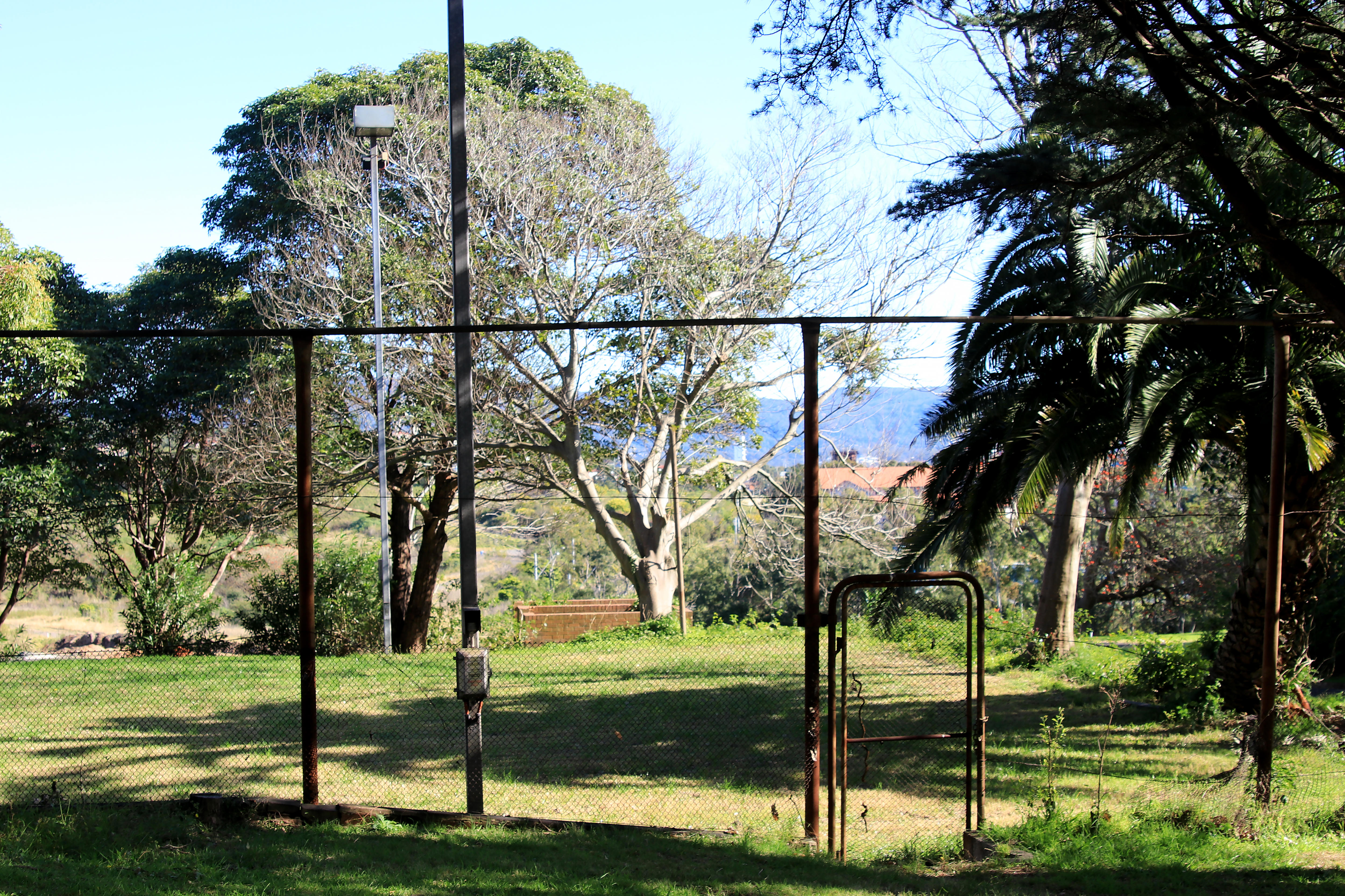 The grass tennis court is recognisable only by remnants of a rusted fence and court lights.