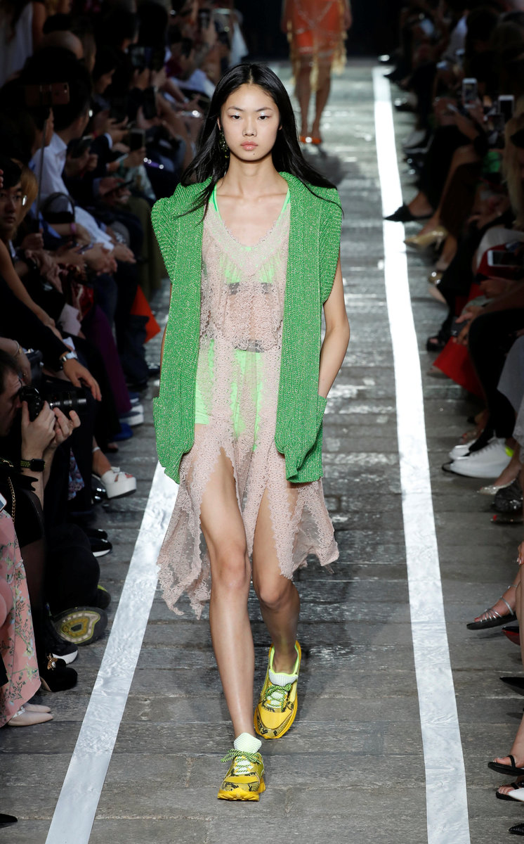 Flowing snakeskin print dresses were worn with cycling shorts or chunky yellow sneakers and a long knitted cardigan was matched with purple gym kit.