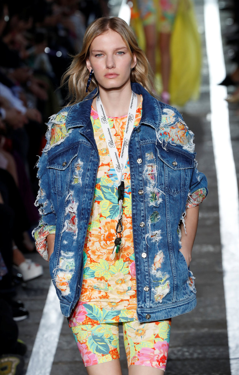 Denim made a brief appearance on the runway, with an oversized distressed jeans jacket worn over a floral patterned lycra onepiece, and ripped jeans were paired with a neon orange men's coat, with brightly colored matching bra and leggings underneath.