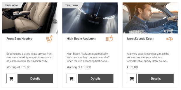 BMW, for example, charges for features like safety-camera information ($30 per month), steering wheel heating ($12 per month), high-beam assistant ($12 per month) in the U.K.